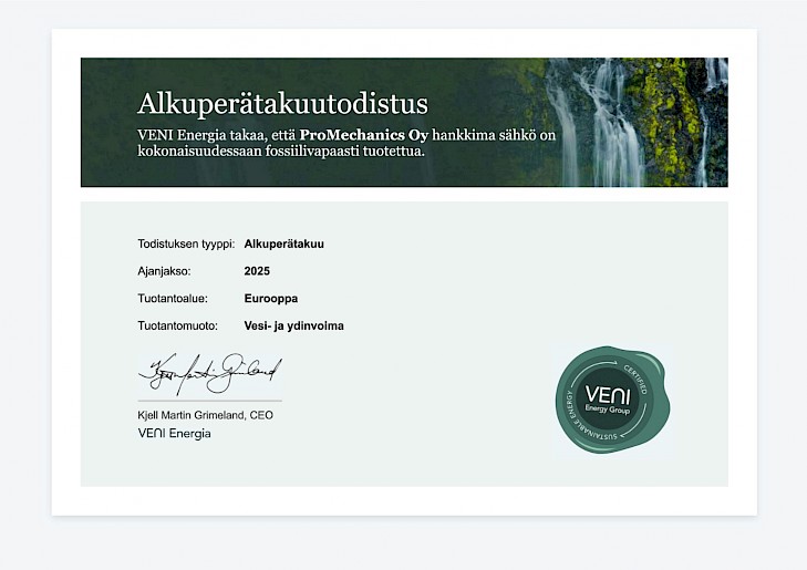 ProMechanicsille välitetty sähkö on hiilidioksidivapailla energialähteillä tuotettua. Käyttämämme sähköenergia täyttää GHG-protokollan Scope 2:n mukaiset hiilidioksidivapaan energian vaatimukset. Sähkö on tuotettu vesi- ja ydinvoimalla jakauman näiden välillä ollessa noin 30 % vesivoimaa ja 70 % ydinvoimaa.
